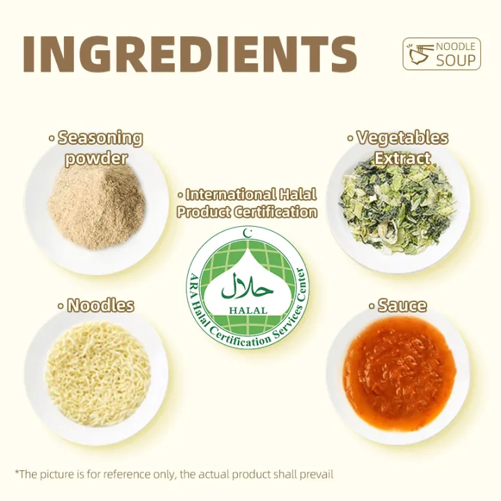 Leves/ízesítő csomag (átlagosan 20 g): Pálmaolaj, só, gyömbér, répapor, vöröshagyma, hagyma, aroma/ízesítő (szójaolaj, gyömbérolaj, kínai angyalgyökér-olaj, 4-hidroxi-2,5-dimetil-3(2H)-furanon, szójabab, földimogyoró), víz, szezámolaj, ízfokozó (nátrium-glutamát), cukor, élesztőkivonat, gombapor, hidrolizált növényi fehérje por (savval hidrolizált növényi fehérje fűszerkeverék/ízesítő (szójabab, búza, víz), maltodextrin, só, ízfokozó (nátrium-glutamát, E627)), Rhizoma kaempferiae por, Angelica dahurica por, fehér bors por, édesgyökér por, csillagánizs por, szárított mandarinhéj por, édeskömény por, fahéj por, kardamom por, szecsuáni bors por, sűrítőanyag (E412), kurkuma, színezékek (paprika).