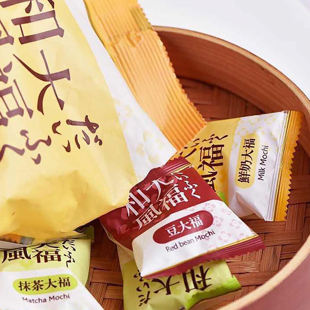 Vörösbab mochi: malátacukor, nyálkás rizs (18,0%), vörösbab 17,17%, sűrítőanyag (E1442), pálmaolaj, aroma, tartósítószer (E200)